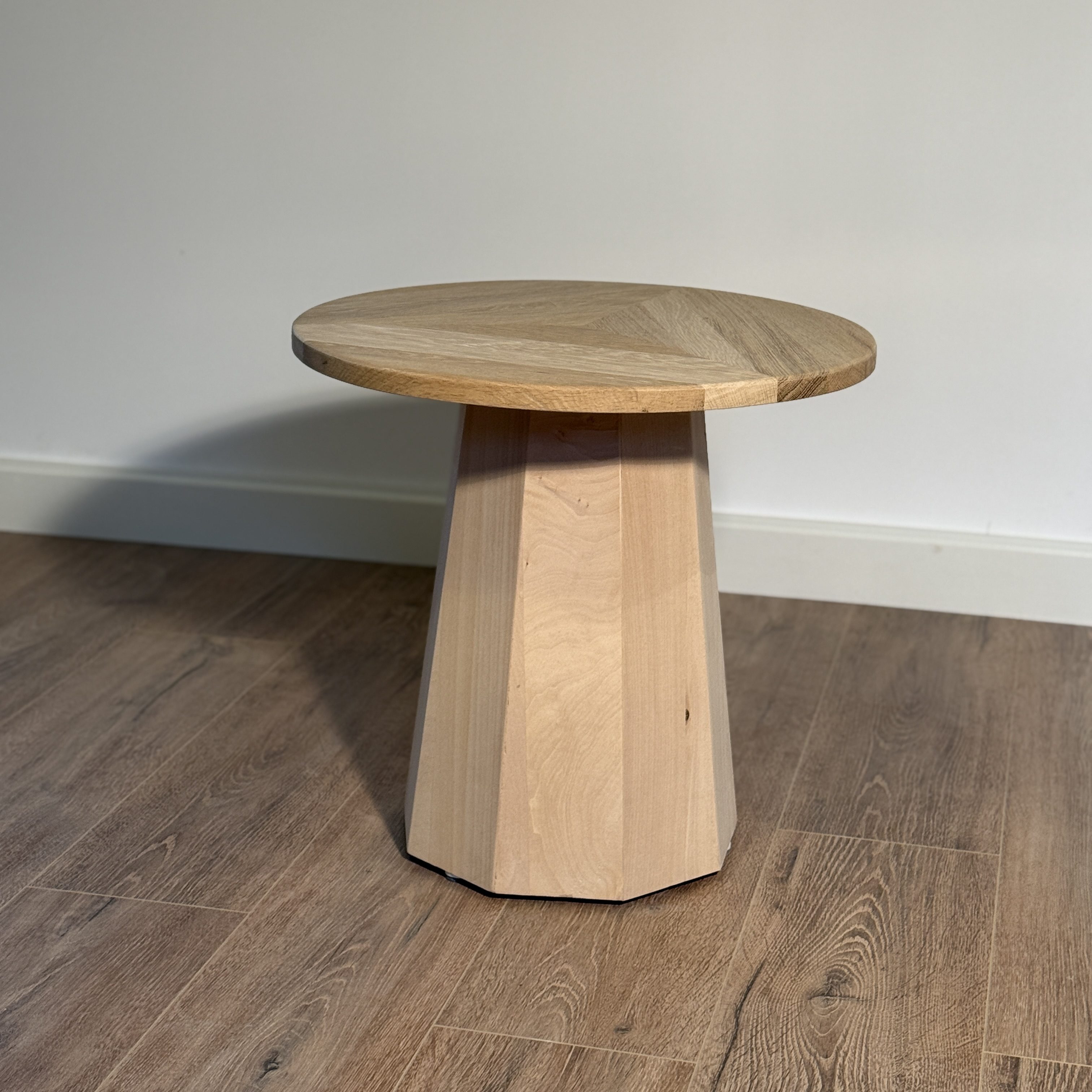 Fabricată din lemn masiv de stejar, măsuța combină durabilitatea cu un aspect natural și elegant. Blatul rotund oferă un echilibru armonios între funcționalitate și estetică. Finisajul păstrează textura autentică a lemnului, evidențiind frumusețea fibrelor naturale și nuanțele calde ale stejarului. Această măsuță este ideală pentru interioare moderne, scandinave sau rustice, servind atât ca piesă decorativă, cât și ca element practic în orice spațiu de locuit.