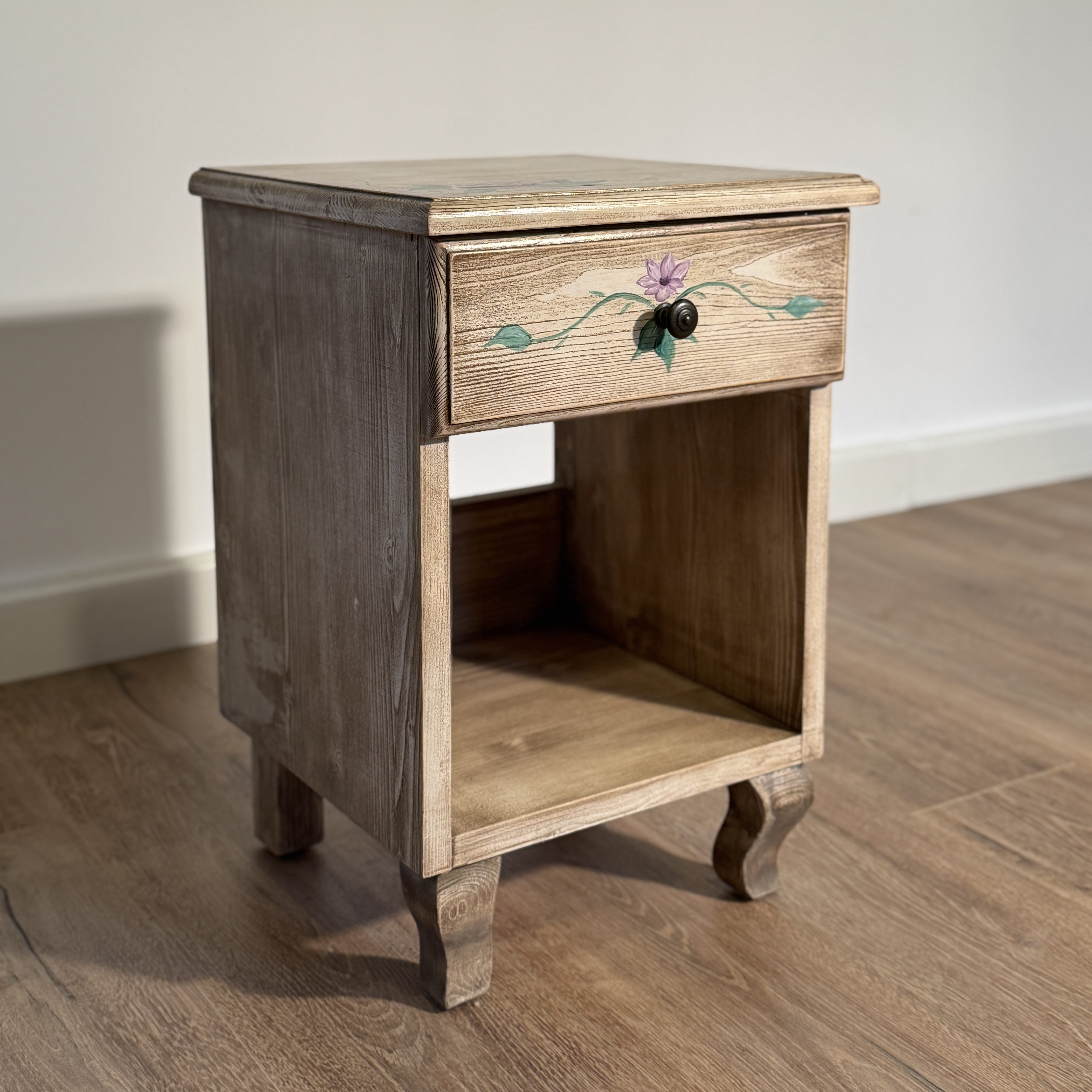 Noptieră patinată și pictată manual este o piesă de mobilier ce adaugă caracter oricărui spațiu. Fabricată din lemn masiv, noptiera are un finisaj îmbătrânit, care îi conferă un aspect vintage autentic.Detaliile pictate manual, adaugă un plus de unicitate și rafinament. Sertarul cu mâner metalic oferă un spațiu practic pentru depozitare, în timp ce raftul deschis de dedesubt permite organizarea cărților sau a altor obiecte decorative.Picioarele ușor curbate completează designul elegant și clasic al piesei. Această noptieră nu este doar funcțională, ci și o declarație artistică, perfectă pentru cei care apreciază mobilierul cu personalitate și detalii lucrate manual.